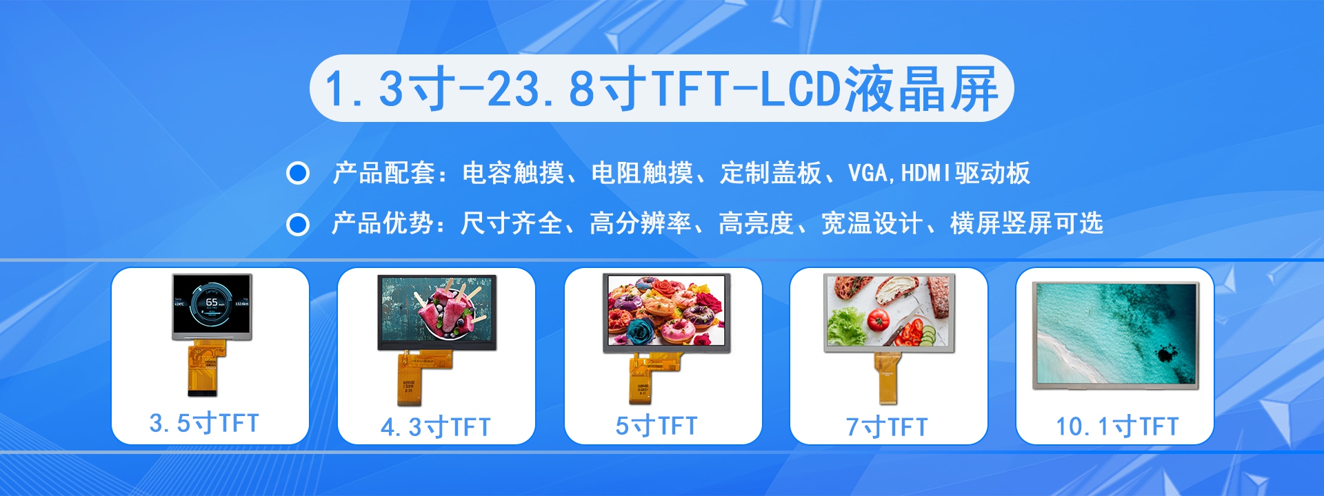 品類齊全( 0.96~27寸常規(guī)屏、條形屏、方形屏、圓形屏、半反半透屏) 常備庫(kù)存(常規(guī)尺寸1~5k安全庫(kù)存) 支持小單( 常規(guī)尺寸1pcs起訂)